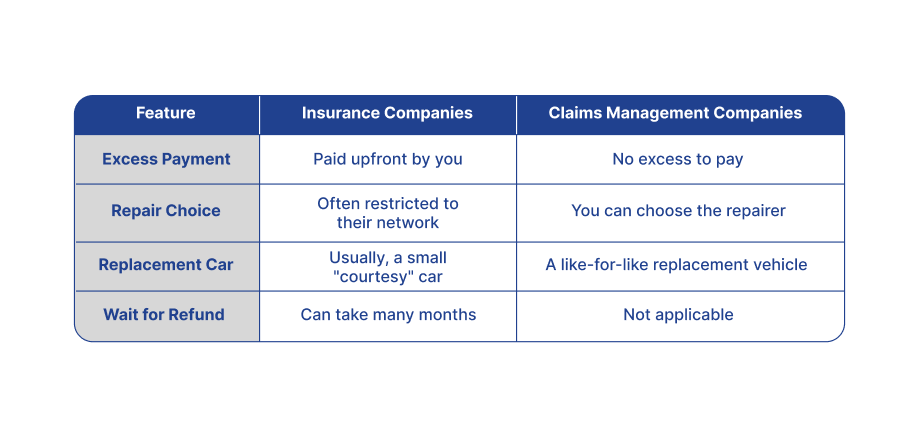 Many claims management companies, like Simple Claims streamlines this process by removing financial friction. We handle all negotiations with the at-fault insurer, so you don't have to wait months for a refund. With us, you get a like-for-like replacement vehicle and high-quality repairs without ever dipping into your own pocket. We protect your finances and help you get back on the road seamlessly.